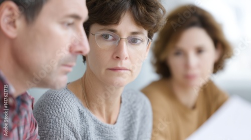 Three individuals engaged in a serious conversation, with one woman intently focusing on a man while another woman observes in the background.