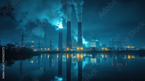 Three industrial chimneys emitting pollution near a body of water