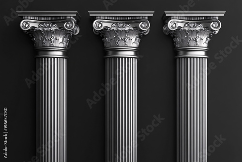 Three intricately designed Corinthian columns stand tall, aligned side by side, against a black background, showcasing classical architectural beauty