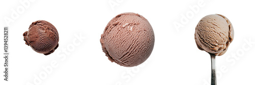 Three isolated minimalist mockups of chocolate ice cream scoops on a plain background showcasing different angles
