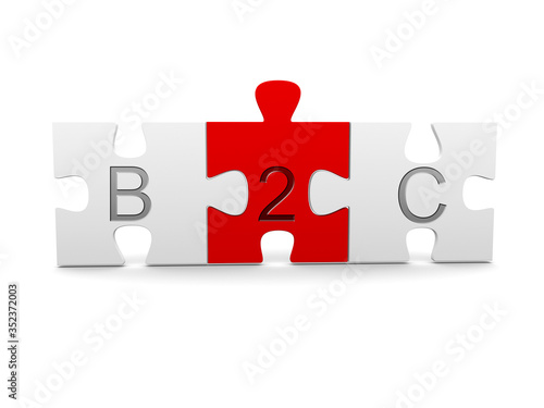 Three jigsaw puzzle pieces with B2C, business to consumer, text on white background - business networking concept