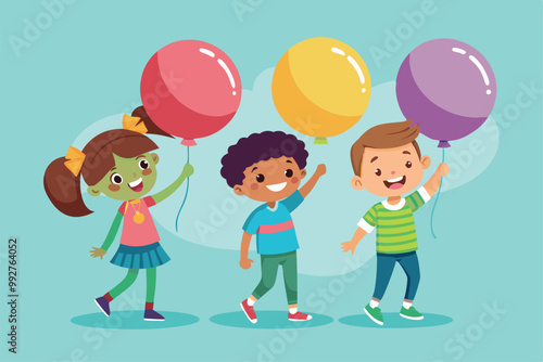 Three joyful children play outdoors, holding vibrant balloons while smiling and having a great time, Customizable illustration of children with oversized balloons.