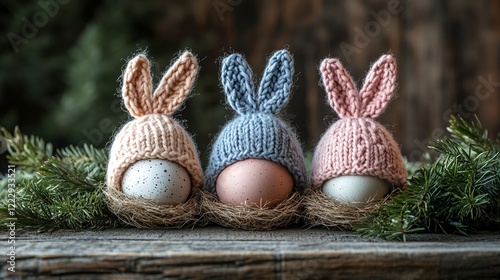 Three Knitted Bunny Ear Hats on Three Eggs in Nests.