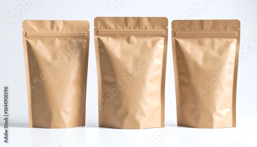 Three kraft stand up pouches shown for food packaging, product branding, retail display, or eco-friendly storage solutions.