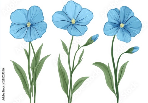 Three light blue flax flowers with green leaves and buds on white background.