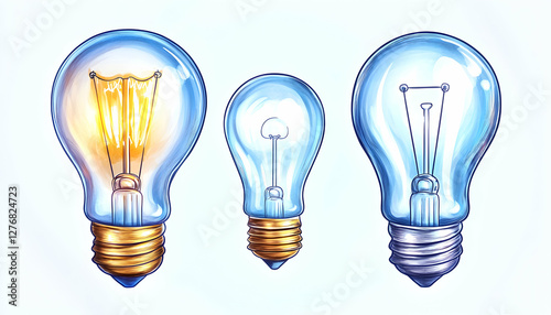 Three light bulbs, different sizes, glowing filaments, on light blue background; for energy efficiency concepts