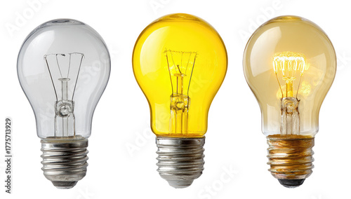 Three light bulbs, each a different color. The bulb on the left is clear, the middle is bright yellow, and the right is amber. All are standard screw-in type