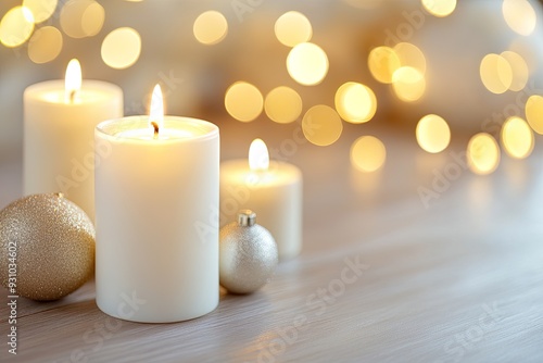 Three lit candles with gold glitter ornaments on a wood background with bokeh lights.