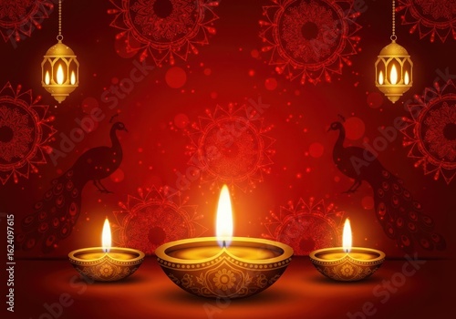 Three lit diyas and golden lanterns with peacock motifs on red background lamp light