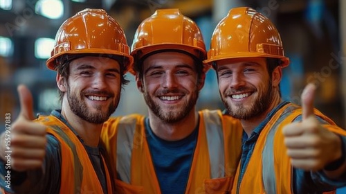 Three male construction workers wearing orange safety helmets and vests smiling and giving thumbs up in a work environment