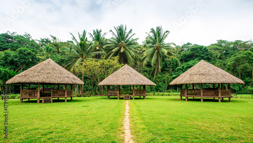 Three Mangrove Huts by Tropical Palms and Green Fields