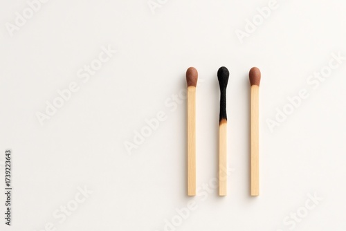Three matchsticks on white background with center match burnt out symbolizing burnout and exhaustion. Represents emotional physical fatigue stress overload and reaching breaking point in work life..