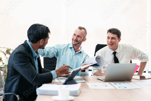 Three men are sitting at a table with a stack of papers in front of them