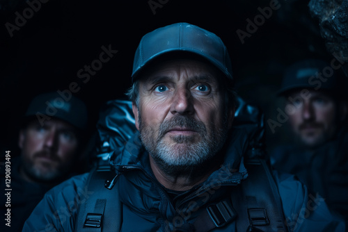 Three men in dark clothing are inside a cave, illuminated by dim light. The focus is on one man’s intense expression, while the others appear in the background, creating a dramatic atmosphere.