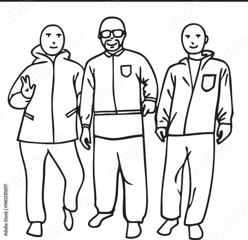 Three men stand together smiling and gesturing in a casual outdoor setting.
