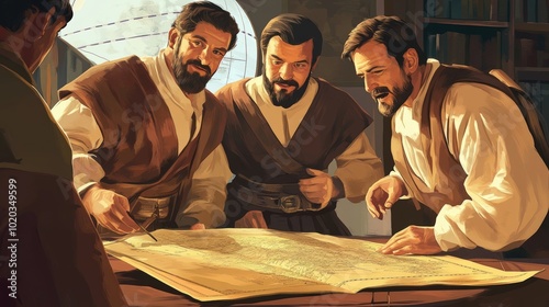 Three men study a large map.