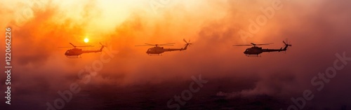 Three military helicopters fly over a battlefield at sunset during a tactical operation