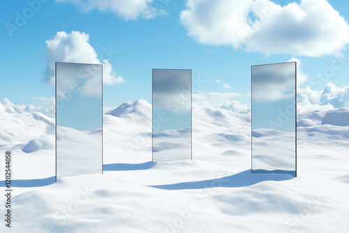 Three Mirrors Reflecting Sky in Snowy Landscape