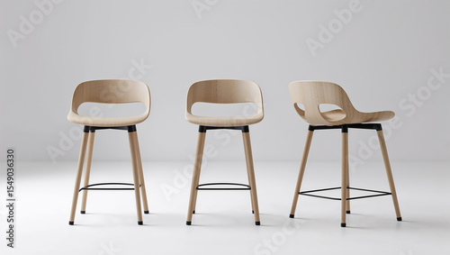 Three modern wooden stools with black metal frame standing in empty room