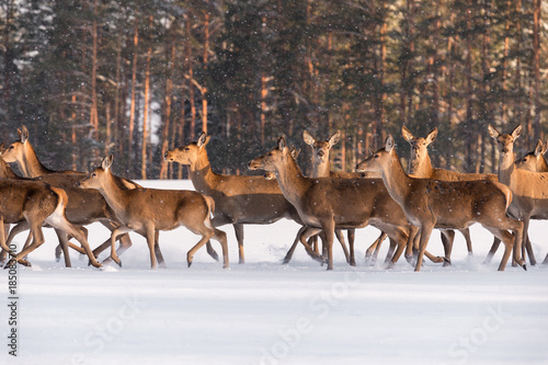 Three Noble Deer Stand Motionless Among The Running Herd In The Background Of The Winter Forest And Look Closely At You. A Herd Of Running Deer (Cervus Elaphus ). Deer Run On Winter Snow. Cervidae.