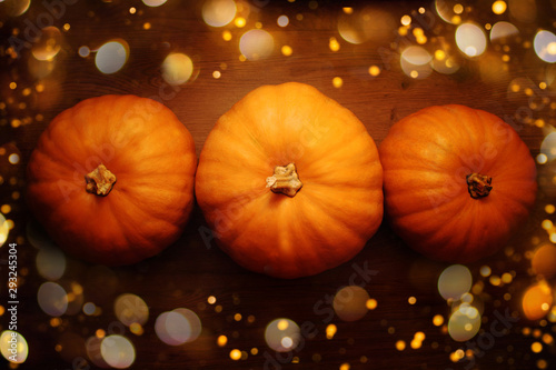 Three orange pumpkins on a wooden background.