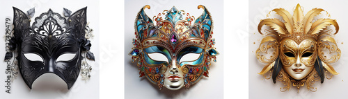 Three ornate Venetian masks; a black cat, a whimsical animal, and a golden jester. Each mask displays intricate detailing and unique design elements.