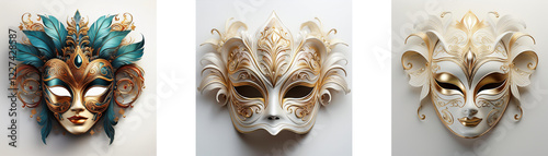 Three ornate Venetian-style masks, each with unique detailing and color schemes. One features teal accents, another beige, and the last off-white with gold highlights.