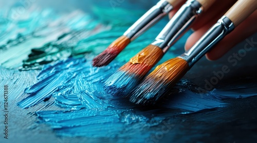 Three paintbrushes with colorful bristles lay amidst blue strokes on a textured canvas, depicting an engaging creative process and modern artistic endeavor.