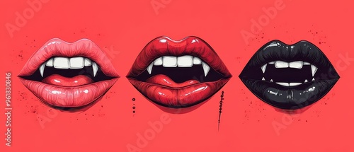Three pairs of vampire lips showing fangs with different lipstick colors