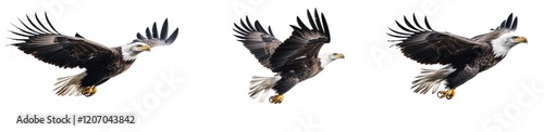 Three panels of an eagle flying in different poses, white background, photorealistic