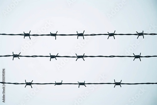 Three parallel strands of barbed wire set against a pale blue sky, conveying themes of restriction and isolation.