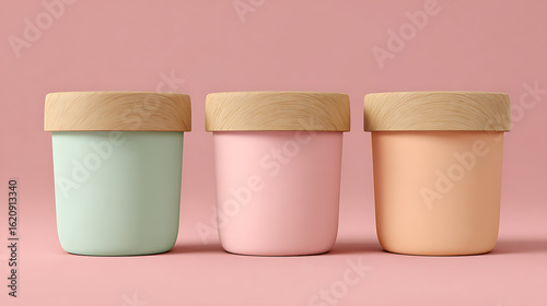 Three pastel colored cylindrical containers with wooden lids mint green pink