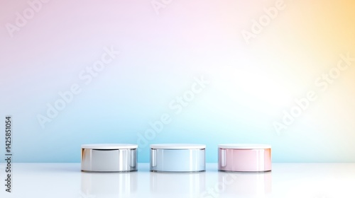 Three pastel-colored circular display stands against a soft gradient background