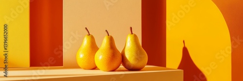 Three pears sit on a shelf against a colorful orange and yellow background.
