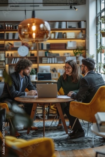 Three people are sitting around a table in a library, working on a project