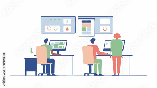 Three people working at computers in an office with charts and graphs displayed on screens on the wall