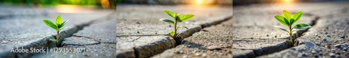 Three pictures of a plant growing in a crack in the pavement. The first picture shows the plant in the middle of the crack, the second picture shows the plant on the left side of the crack