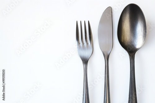 Three pieces of silver-gray kitchen silverware on a white backdrop. Generative Ai
