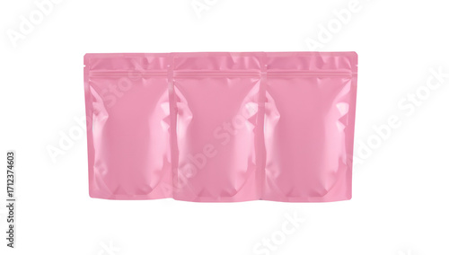 Three pink resealable stand up pouches against a black background displaying product packaging
