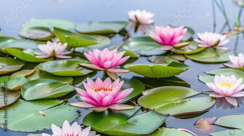 Three pink water lilies bloom on large, green lily pads in a calm pond