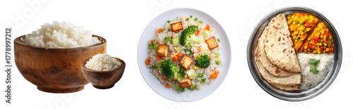 Three plates showcasing rice based dishes with vegetables tofu and indian bread on a transparent background