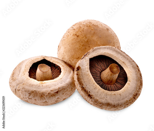 Three portobello mushrooms, isolated on white background.