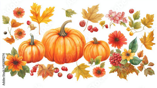 Three pumpkins, fall leaves, flowers, and berries against a white background.