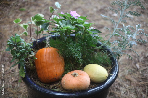 THREE PUMPKINS IN A BLUE PLANTER WITH BLOOMNG FLOWER AND PLANTS