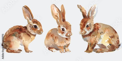Three rabbits are sitting in a row, with one on the left, one in the middle, and one on the right