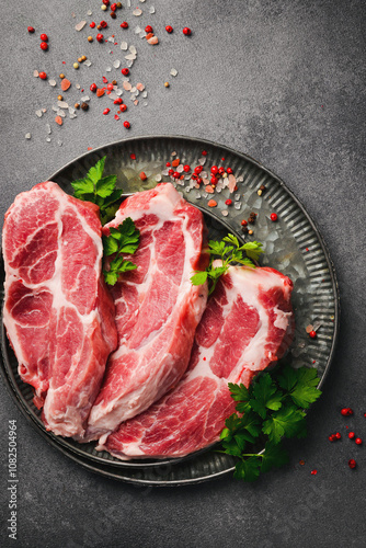 Three Raw pork steak with spices on a plate. Raw meat. On a gray stone background.