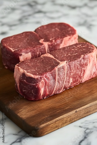 Three Raw Ribeye Steaks on Wooden Cutting Board
