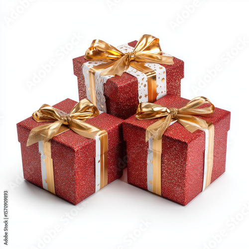 Three Red Gift Boxes with Gold Ribbons , white background cut out PNG