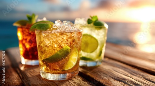 Three refreshing cocktails are beautifully arranged on a table, with vibrant colors and fresh garnishes, set against the stunning backdrop of a serene sunset by the sea.