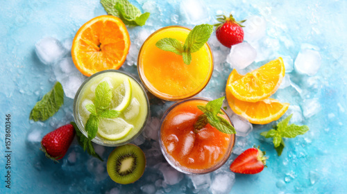 Three refreshing fruit juices garnished with mint leaves surrounded by fresh fruit slices and ice on a blue textured surface.